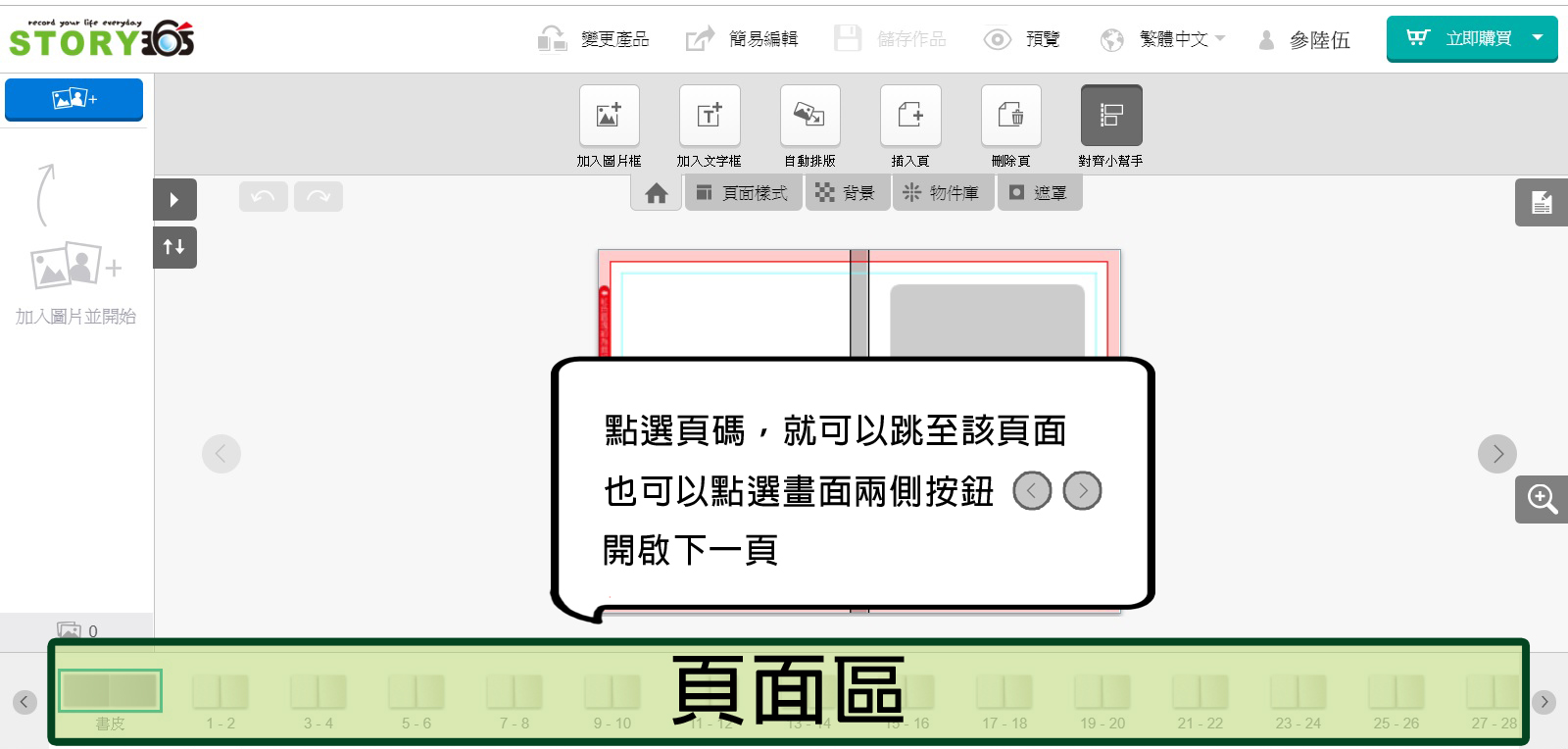 挑選要放入的頁面樣式,用滑鼠以拖拉方式,拖拉放入頁面。
