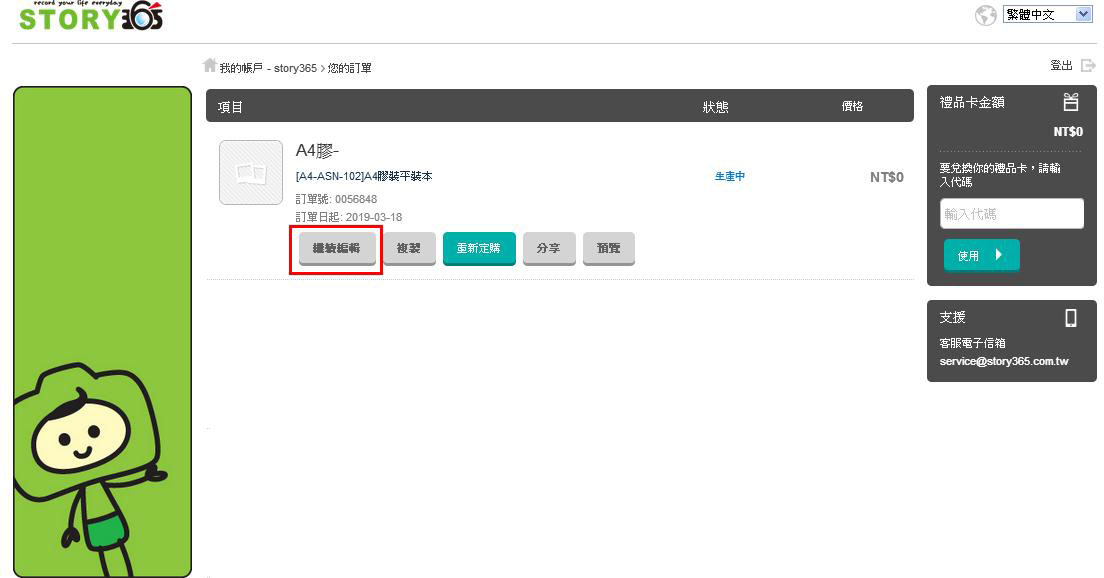 Step2. 我的訂單 > 作品名稱下方「繼續編輯」